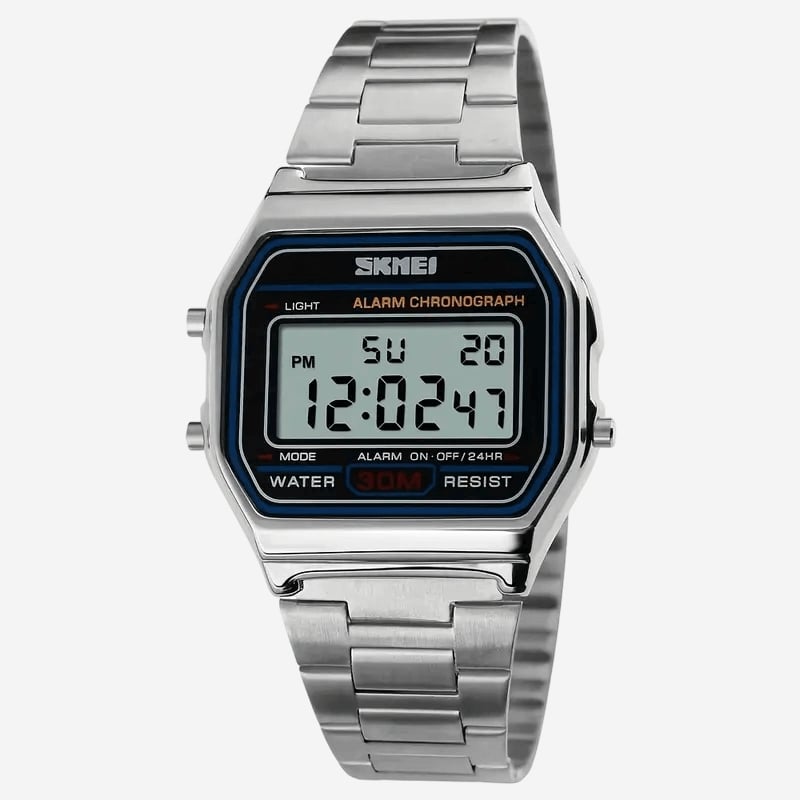 მოდური და კომფორტული ციფრული საათი, რომელიც აერთიანებს კლასიკურ დიზაინს და პრაქტიკულ ფუნქციებს. შესაფერისია ყოველდღიური გამოყენებისთვის, სპორტისთვის ან casual სტილისთვის. ციფრული ეკრანი – დრო, თარიღი და კვირის დღე, წყალგამძლე – 30 მ-მდე, ღამის განათების რეჟიმი, გამძლე უჟანგავი სამაჯურით.